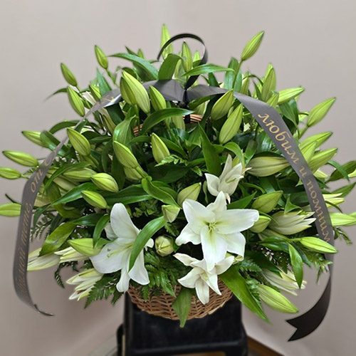 Жалобний кошик з білими ліліями — це скорботний і шляхетний символ пам’яті та поваги. Білі пелюстки уособлюють чистоту душі, спокій та світлу путь, а сама композиція звучить як щире прощальне слово. Такий букет допомагає висловити почуття любові та подяки, зберігаючи образ дорогої людини у серці. Кошик з живими ліліями стане гідним супроводом у момент прощання, наголосивши на світлій скорботі та глибині спогадів.
